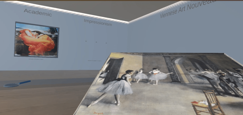 By using modern AR/VR technology, artists can create new experiences like never before. In this example, a virtual reality art museum allows users to explore and engage in an interactive exhibit. In this experience, users collect famous works of art that have been misplaced in the gallery. As the user collects and places the items in the correct areas, educational information is displayed providing details such as the artist, name of work, and related art movement.